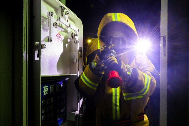 紧张的战斗节奏并未就此结束。突然,火警警报响起——前液压站发生意外“起火”。损管队员闻令而动,迅速赶赴现场展开救援。他们分工明确,行动果断,通过有序的协作,成功扑灭火情,展现出专业化的应急处置能力。